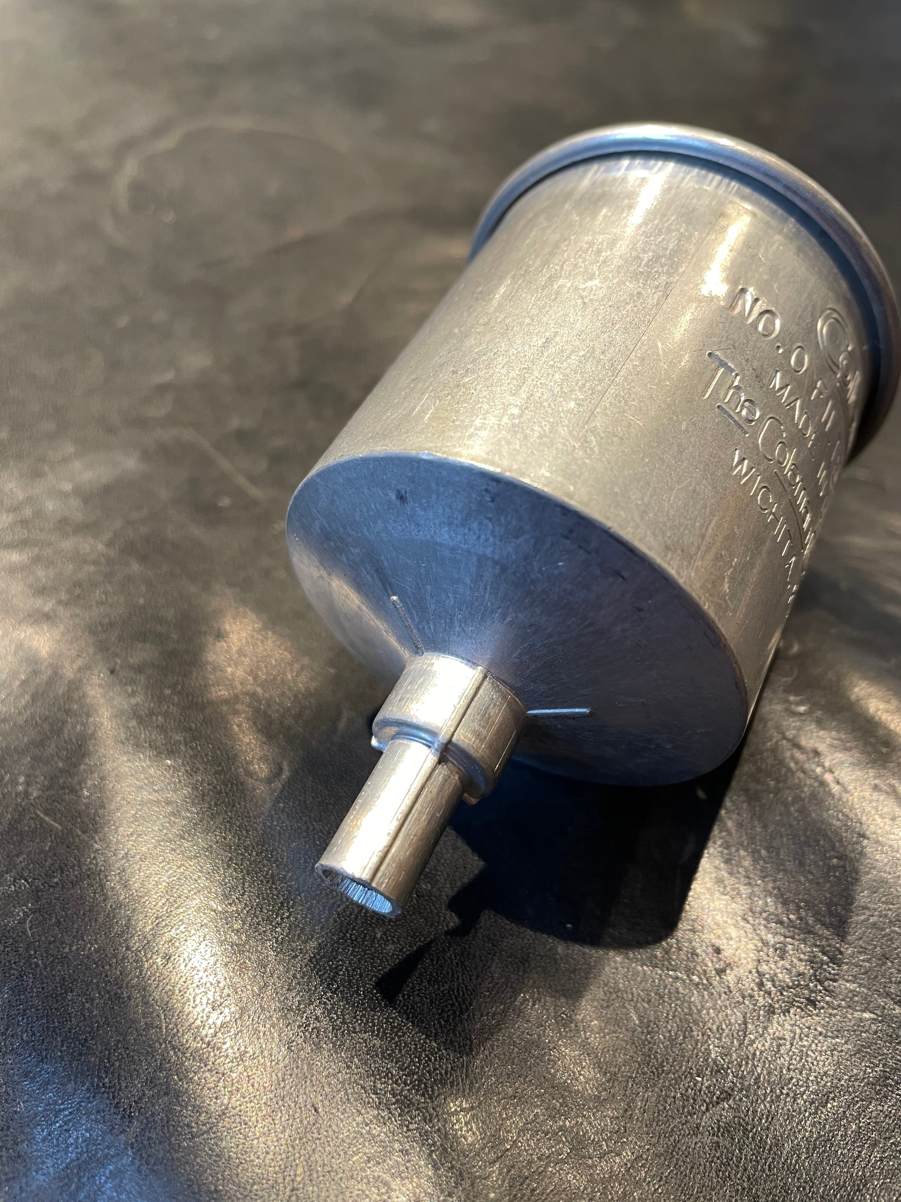 現在販売されている赤いプラスチック製のファネルとは異なり、アルミ製は製造年代が古く、希少価値のあるビンテージアイテムとして扱われています。現行モデルには口径が小さくて入らないビンテージモデルにも使用できるため、コレクターや古い製品の愛用者に人気です。