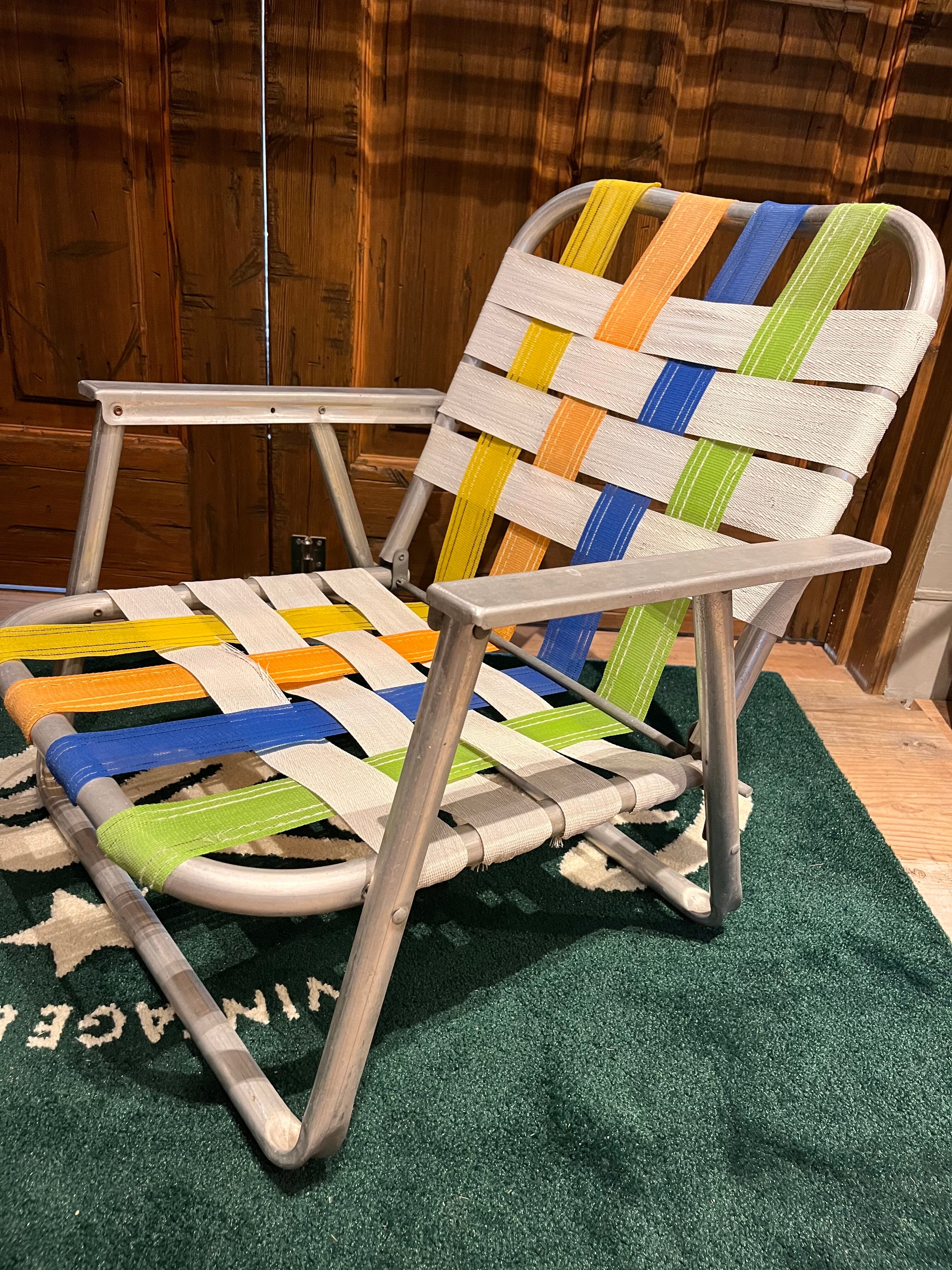 アルミの本体にカラフルなウェビングベルトが貼られており頑丈かつ軽量の折り畳みチェア