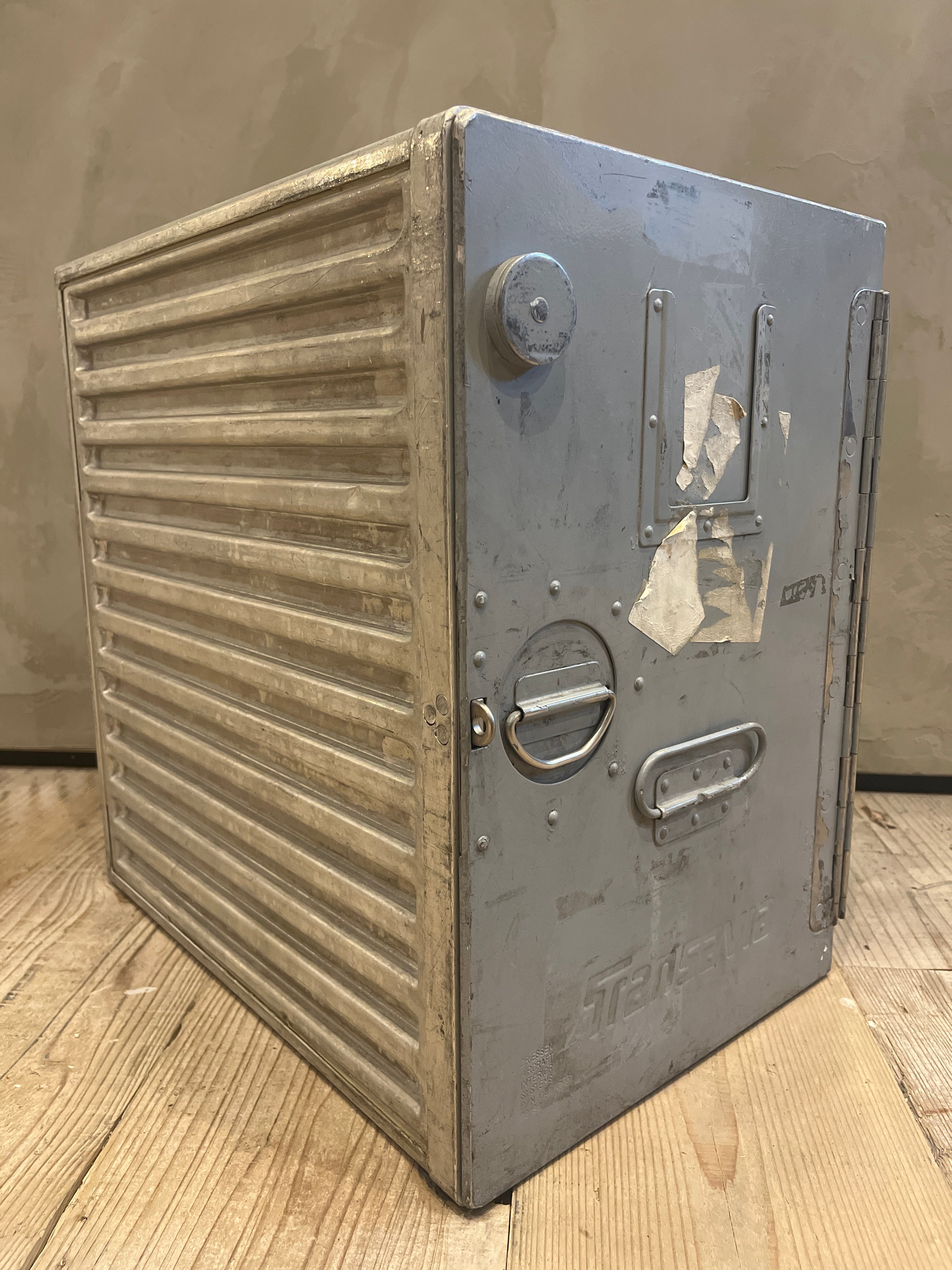 本来、飛行機で使用されていたFood container。新品にはないアルミの色合いとルックスがキャンプや家の見せる収納としてオススメの逸品です。